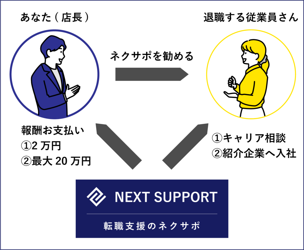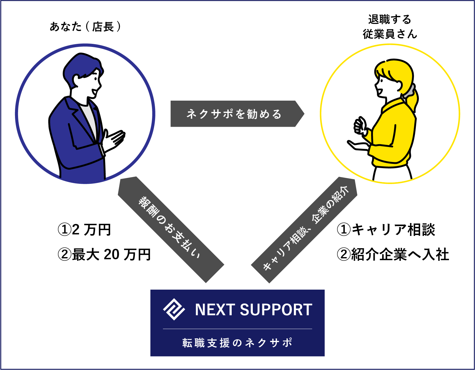 飲食店で店長をしています。社員もパートさんも入れ替わりが激しく、いつも人手不足で困っていました。この紹介プログラムの話を聞いて、次の仕事が決まっていない方にお声がけしたところ、「私のことをそこまで考えてくれてありがとうございます」と感謝の声をもらいました。辞める従業員に感謝されて、自分は副収入を得ることができ、win-winです。今では辞めたい、と切り出されても、前向きに相談に乗ってあげられるようになりました。